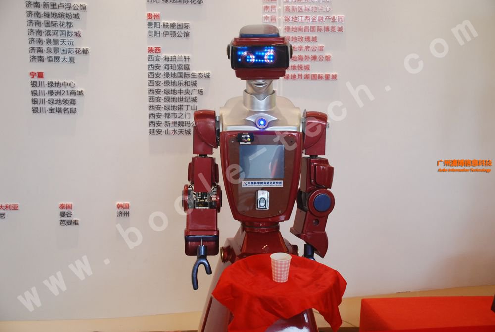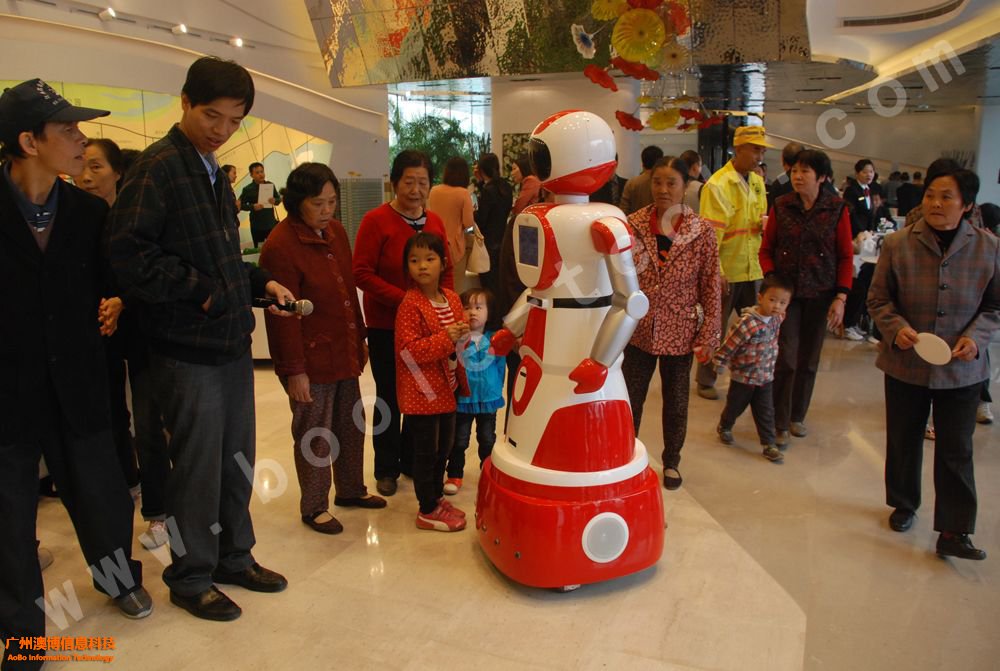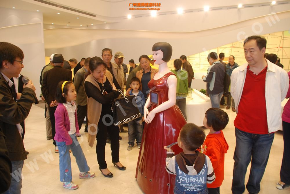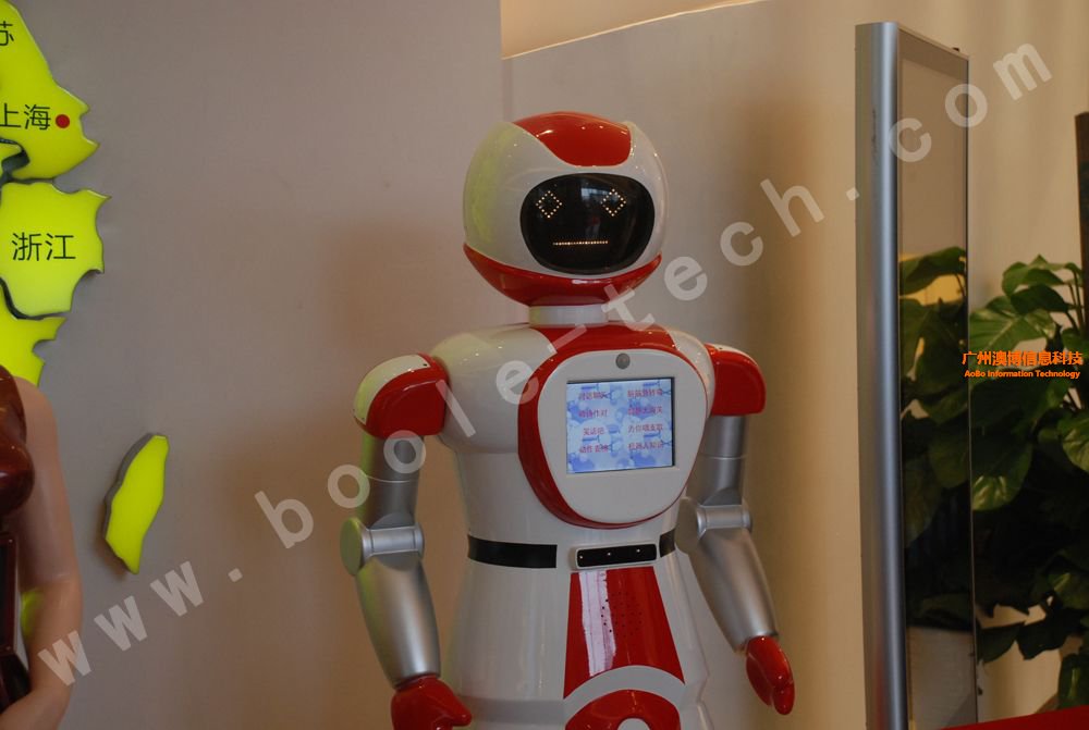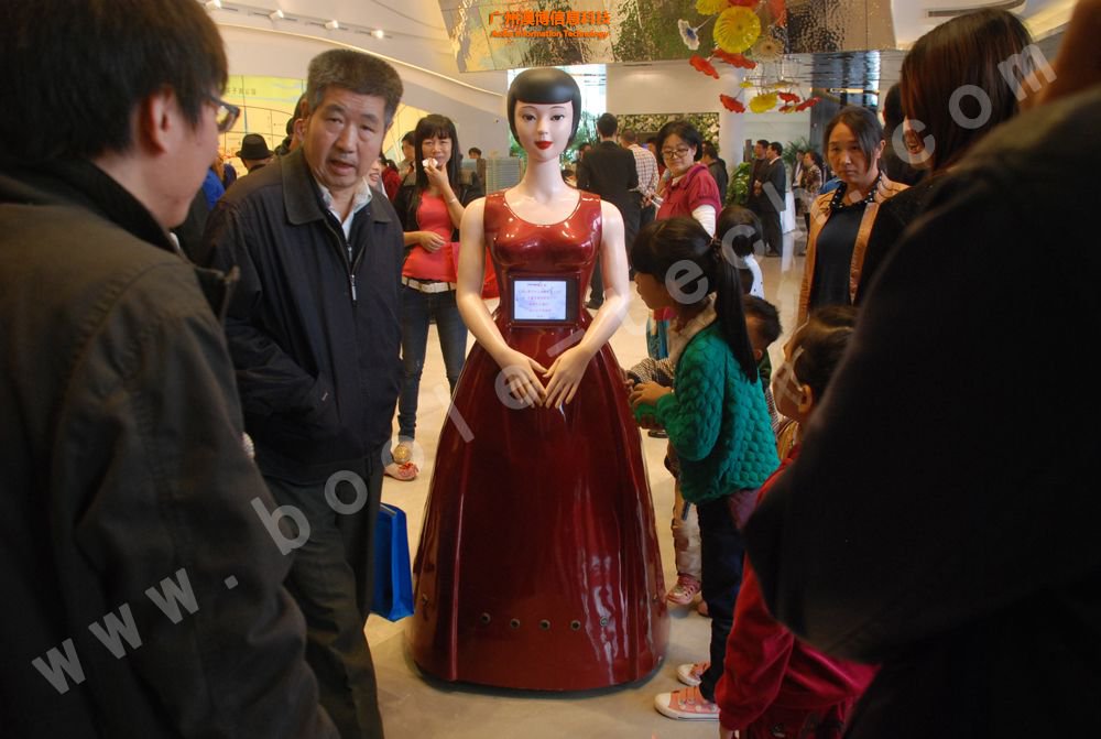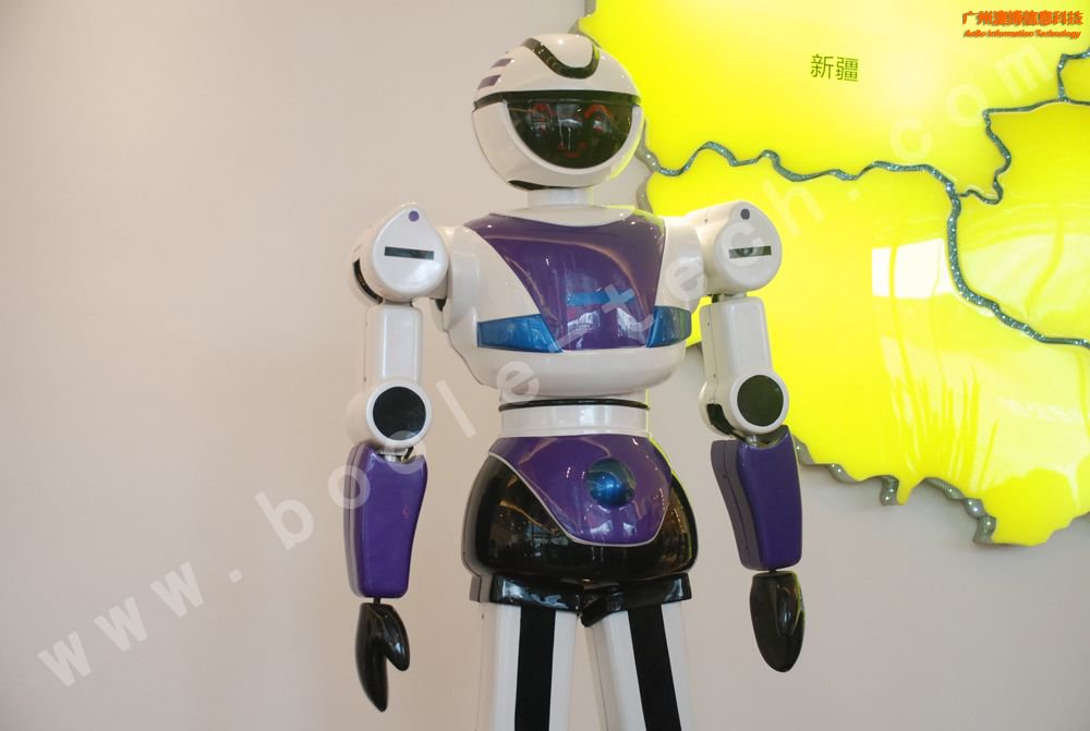 這是一款美女外形的迎賓機器人,曾經(jīng)上過中央電視臺CCTV10科技頻道,其胸前有一塊屏幕,能展示相應(yīng)的信息,機器人擁有語音識別功能,能夠與觀眾對話。機器人底部有多個傳感器,能自動避開障礙,并能按照預(yù)先設(shè)定的路線行走。