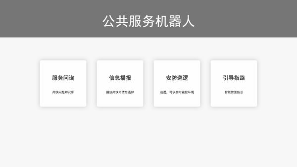 高鐵站+機器人解決方案 產(chǎn)品介紹 每當節(jié)假日,高鐵站客流大量增加,咨詢客服人員需要排隊等候,大大降低了高鐵站的服務質量。智能機器人可以高效完成服務問詢、位置指引,信息...