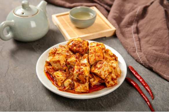 川菜中的麻婆豆腐,赫赫有名。創始于清朝(1862 年),開業于成都北郊的萬福橋,店家女主人陳氏善于烹調菜肴,尤其她用牛肉末、蒜苗、辣椒、花椒、豆瓣醬等燒制的豆腐,味美可口,麻辣鮮香,深受人們喜愛,特別是挑夫們吃了麻婆豆腐,胃口大開、渾身舒暢、腳力倍增。文人騷客也常來品嘗,因陳氏臉上幾顆星星點點的麻子,笑稱為“麻婆豆腐”而得名。麻婆豆腐含有植物蛋白和氨基酸,可降膽固醇;牛肉補氣養胃;蒜苗殺菌、降血脂;花椒可去腥、健胃除濕。所以麻婆豆腐不但美味,而且健康。以上無一不顯示著豆腐無窮魅力與神奇,成為當之無愧的“素食之王”。