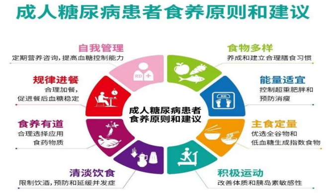 膳食管理和治療是糖尿病患者血糖控制的核心,應(yīng)遵循平衡膳食的原則,做到食物多樣、主食定量、蔬果奶豆豐富、少油、少鹽、少糖,在控制血糖的同時,保證每日能量適宜和營養(yǎng)素攝入充足。