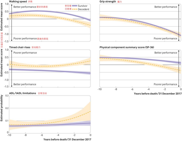 結果顯示,步行速度、坐站能力、握力差分別會使死亡風險增加22%、14%、15%,日常活動困難則使死亡風險增加30%。而且,隨著年齡增加,這種關聯變得越來越強。