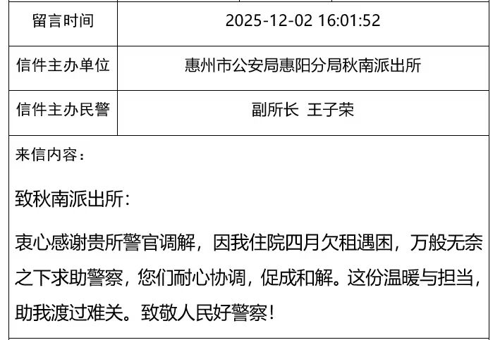 這封感謝信,是群眾對(duì)惠陽(yáng)公安工作的高度認(rèn)可與信賴(lài)。在每一次糾紛調(diào)解中努力為群眾排憂解難,讓執(zhí)法服務(wù)有力度、更有溫度。